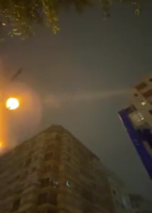 night scene in what appears to be an urban environment. The camera angle is looking up at a multi-story building with a distinctive architectural style. A street lamp is visible on the left side of the frame, providing illumination. There are also some tree branches at the top of the frame, partially obscuring the sky. Sounds of fireworks can be heard intermittently, and bright flashes are seen in the sky. It appears to be either snowing or raining lightly.