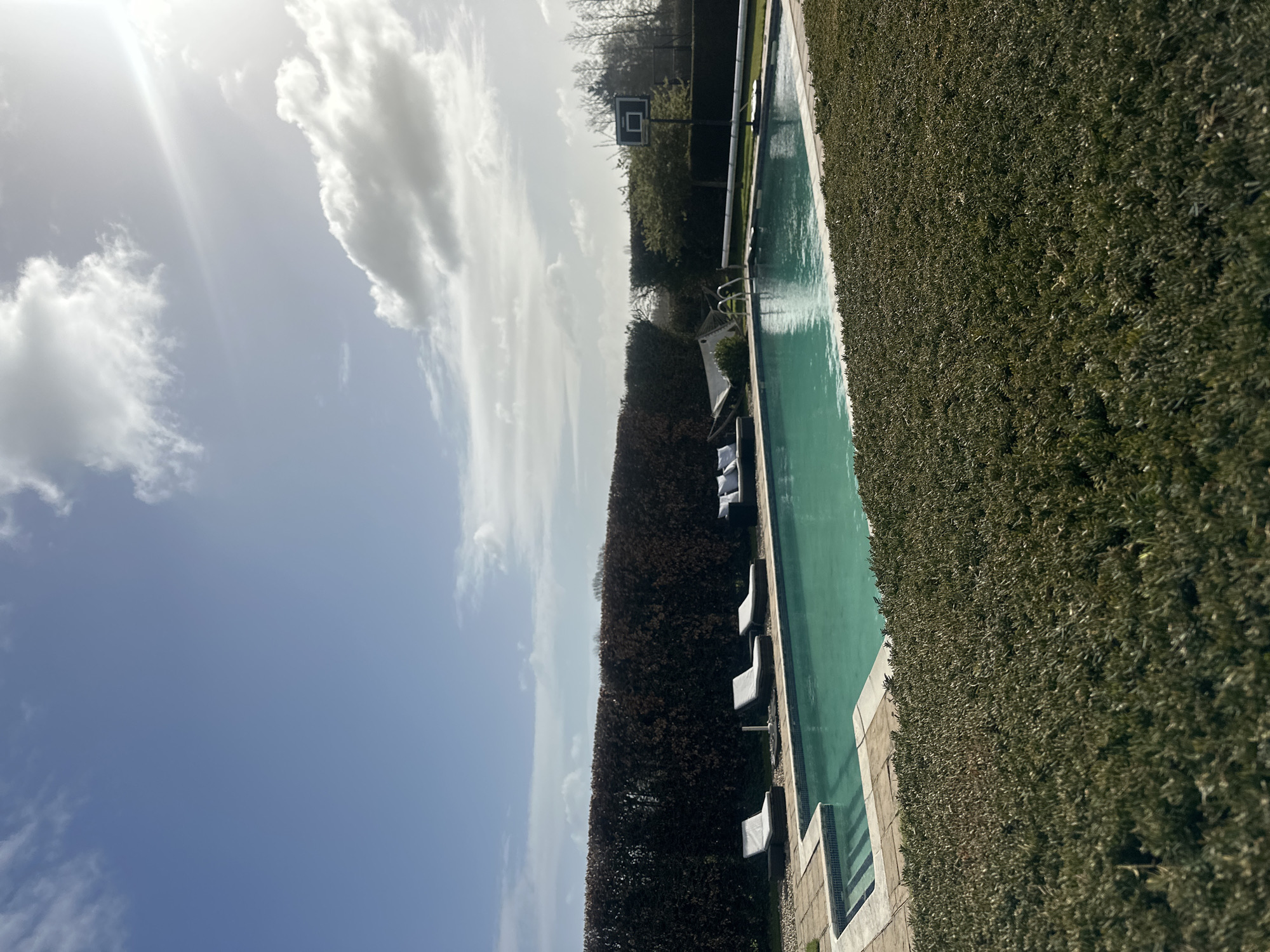 n outdoor swimming pool located in a residential area of Tunbridge Wells, United Kingdom. The sky is partially cloudy with a mix of blue sky and white clouds. The pool is long and rectangular, surrounded by trimmed hedges. Lounge chairs are positioned along the pool's edge. A basketball hoop is visible in the background beyond the hedges. The day appears to be sunny with bright light.