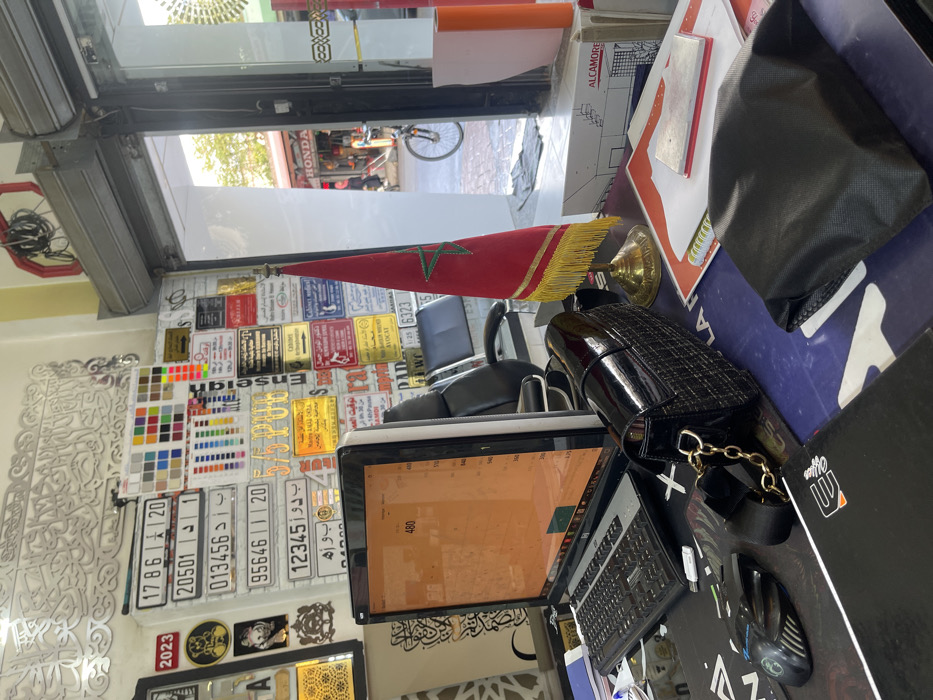 This image depicts the interior of a commercial shop, presumably a sign-making or customization business, located in the city of Meknes, Morocco