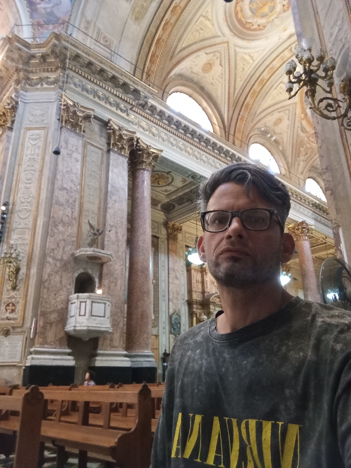 An adult man with glasses and a gray Nirvana t-shirt is posing in a large, ornate building