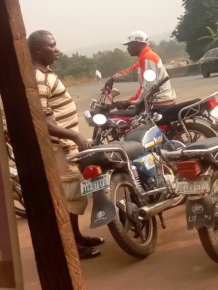 Two men converse near parked motorcycles. One man wears a striped shirt and beige shorts, standing near a wooden post. The other sits on a red motorcycle, sporting a white cap labeled "OYSG" and an orange-and-gray jacket. The motorcycles, one blue and one with a visible license plate "LEE-488-ENU", line the roadside. The background shows a road, other vehicles, and distant trees under a hazy sky.