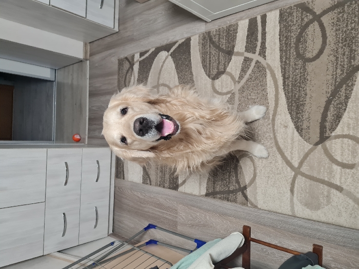 - "A golden retriever lies on a gray rug with large, swirling patterns" by FM-EqdoN2, licensed under CC BY 4.0
