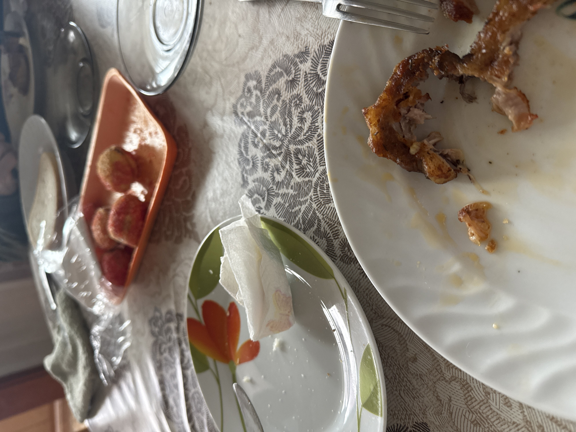 An overhead view of a table setting. The tablecloth has a textured, floral pattern in gray and white. A white plate with remnants of fried meat is visible in the upper right. A fork rests on the plate. To the left, there is a glass and an orange tray containing sliced peaches. A small, round plate with a floral design contains a crumpled napkin and a knife. The scene is likely a dining table after a meal. It is not possible to determine the location as Lovech, Bulgaria, from the image alone.