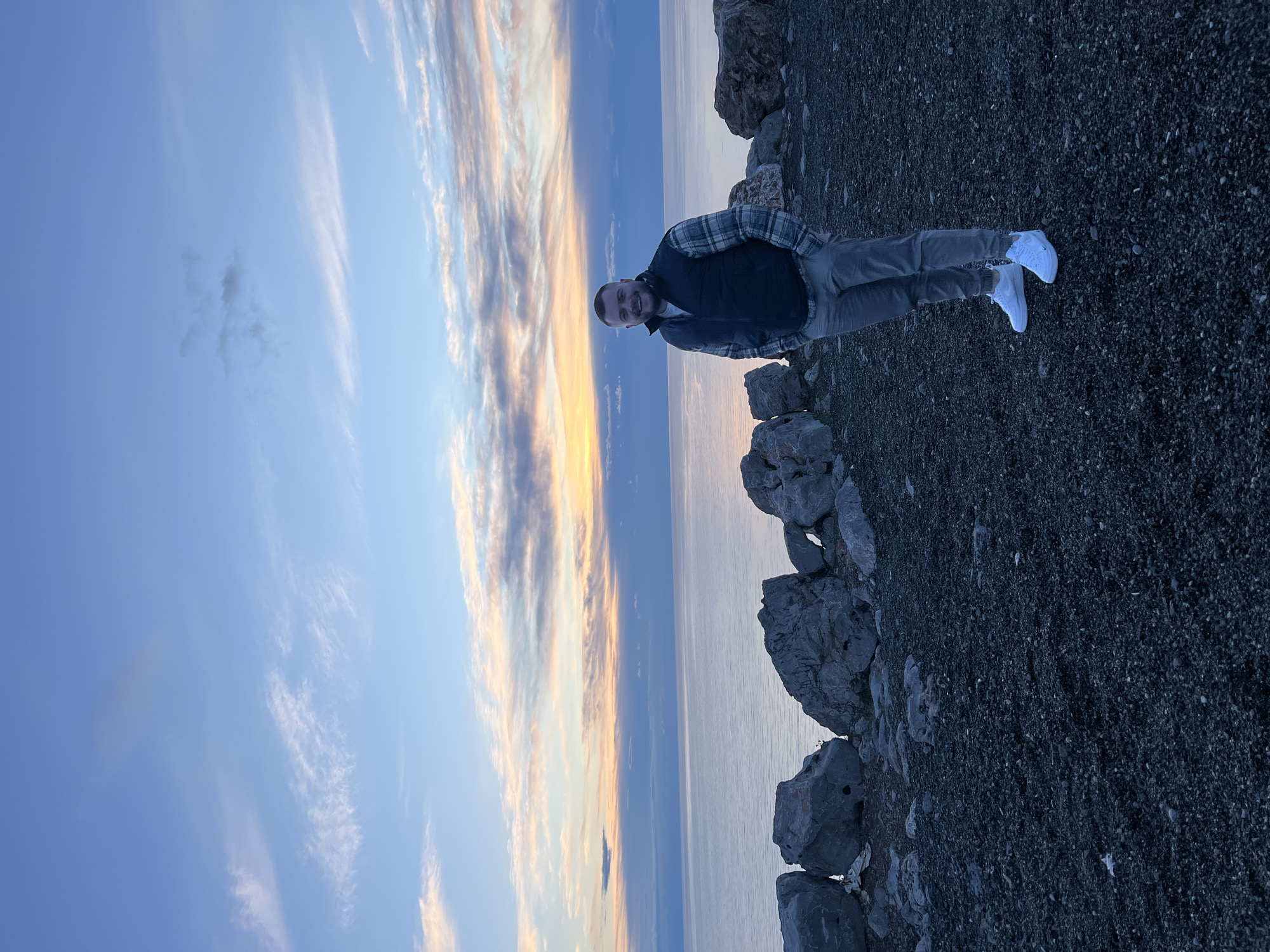 A man stands on a rocky coastline against a backdrop of a cloudy sunset over the sea. He is wearing a plaid shirt, a dark vest, gray pants, and white shoes. The ground is rocky and consists of small pebbles. The sunset is a mix of blues, yellows, and oranges. The location is Kovačko Polje, Montenegro.