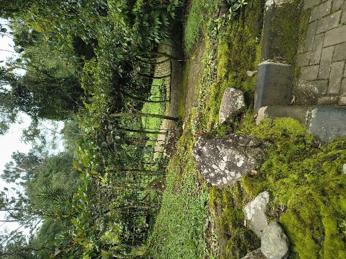 A stone path leads between trees and greenery. Moss covers rocks beside stone steps. A gate-like structure spans the path further down, leading to an area of brighter light. Lush trees and foliage surround the scene. The path is made of light-colored brick.