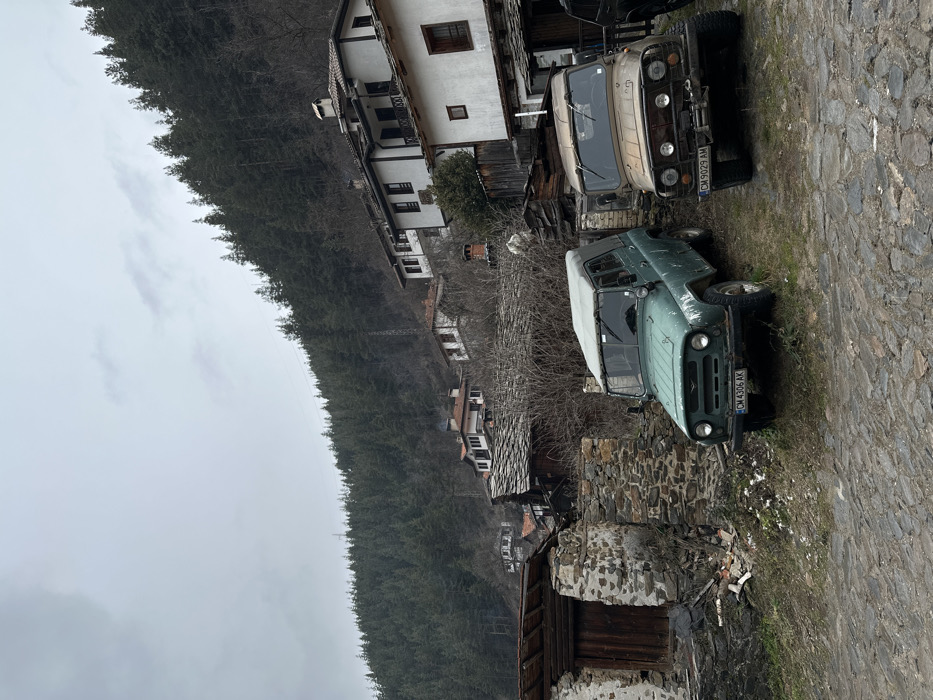 This image captures a static outdoor scene in the village of Shiroka Laka, Bulgaria, under an overcast sky. The foreground features an unpaved, uneven dirt and grass area, with a cobblestone path partially visible at the bottom. Two vintage off-road vehicles are parked on the unpaved ground, facing generally towards the viewer. The vehicle on the left is a faded green soft-top 4x4, possibly a UAZ-469, bearing Bulgarian license plate "CM 4306 AK" on its front bumper. It exhibits wear, with chipped paint and visible rust. To its immediate left is a partially collapsed stone and timber structure with a dark wooden door. Scattered debris, including fragmented materials, lies near this structure. The vehicle on the right is a tan/khaki-colored soft-top 4x4, similar in model, displaying Bulgarian license plate "CM 9029 AM." This vehicle also appears weathered, with exposed metal on its front grille and bumper area, possibly indicating modifications or damage. Behind the vehicles and foreground structures, a steep, densely forested mountain slope rises, covered primarily with dark evergreen trees. Interspersed on the hillside are numerous traditional Bulgarian houses characterized by white-washed walls, dark wooden trim, and distinctive stone slab roofs. These multi-story buildings ascend the terrain, with some appearing well-maintained and others showing signs of age. Power lines and utility poles are visible traversing the hillside among the trees and houses. No individuals or active subjects are present in the scene.