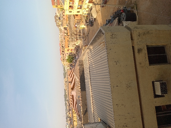 An elevated view captures a densely packed urban environment in the city of Unknown, Unknown, under clear, light blue sky conditions. In the immediate foreground, the upper section of a light beige, multi-story concrete building with a corrugated metal roof is visible. The building's exterior shows signs of weathering and discoloration. A window-mounted air conditioning unit is affixed to a lower-level window. Below and beyond this foreground structure, an unpaved road or street meanders through the scene. Along the street and adjacent to buildings, numerous black cylindrical and rectangular water storage tanks are present. Multiple vehicles, including cars and motorcycles, are parked or moving along the road. A few indistinct human figures are visible on the street. The street is flanked by numerous multi-story buildings constructed of concrete, displaying various shades of faded yellow, orange, and brown paint. Most buildings feature corrugated metal roofs. Electrical utility poles and overhead wiring are distributed throughout the area. The urban landscape extends into the background, with additional buildings ascending a gentle incline, diminishing in detail with distance. A slight atmospheric haze is present over the distant cityscape.
