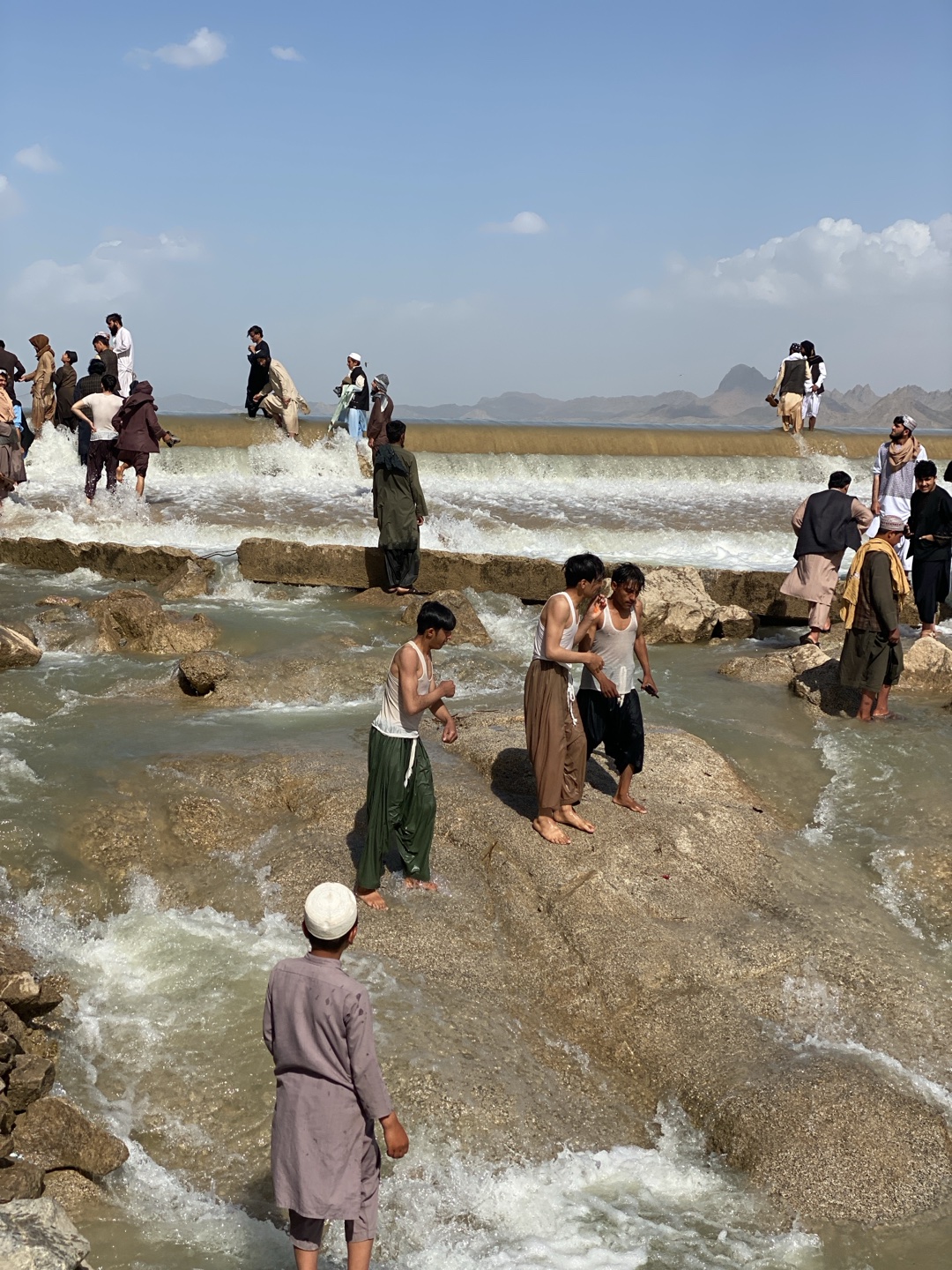 A large group of men are near a body of water on a sunny day in Kim, Afghanistan. Some men are wading in the water, while others are standing on rocks or on a man-made dam-like structure. Most of the men are wearing traditional Afghan clothing, including loose pants and tunics. Some men are wearing white caps or turbans. The water is flowing rapidly and is churning in some areas. In the background, there are low-lying mountains. The sky is blue with some clouds.