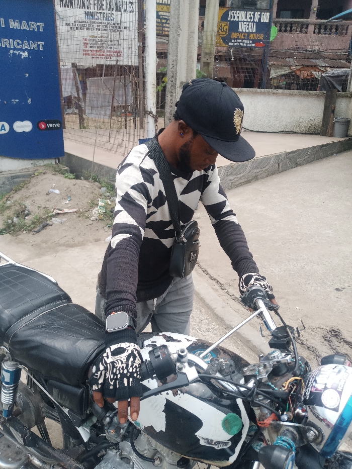 A male individual stands next to a motorcycle on a paved surface in Umuode, Nigeria