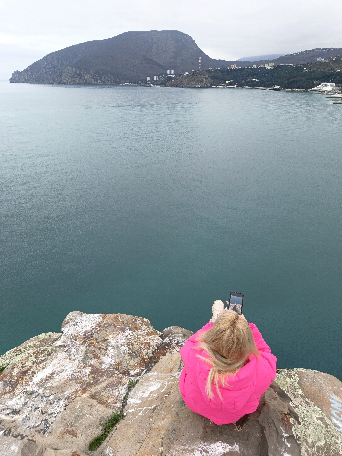 The image depicts an elevated view of the Black Sea coastline near Utios, Ukraine, under an overcast sky. In the immediate foreground, a person with long blonde hair is seated on a rocky cliff edge, facing away from the camera and towards the sea. The individual wears a padded fuchsia-pink jacket and light-colored sneakers. They are holding a black smartphone vertically in both hands, with the screen displaying an image, possibly of their feet or the immediate ground below. The rock formation beneath the person is mottled grey and brown, featuring patches of white mineral deposits or bird guano, sparse green vegetation, and faded graffiti. Beyond the cliff edge, a large expanse of calm, teal-colored water fills the midground. In the background, a substantial dark, rocky mountain range, consistent with Ayu-Dag, rises from the sea on the left. Along the base of this mountain and extending to the right, various buildings and structures are visible, including multi-story white buildings scattered along the shore and slopes. A distinctive red and white striped tower, consistent with a communication or navigational structure, stands on a smaller hill. Further to the right, additional coastal development and green vegetation line the shore under the uniformly grey, overcast sky.
