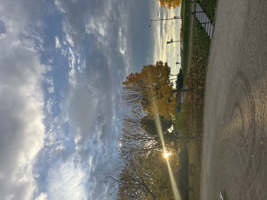 This image depicts an autumnal outdoor scene in Hœrdt, France, under a partly cloudy sky. The sun, positioned low on the left horizon, casts a prominent lens flare and warm light across the lower-left and central portions of the frame. The foreground features a light-colored, level ground composed of gravel or dirt. Two distinct, concentric circular tracks are impressed into this surface in the lower-left quadrant. Scattered dry, brown, and yellow autumn leaves are visible on the ground. Midground elements include a cluster of deciduous trees displaying yellow and orange foliage, indicative of autumn. Some trees exhibit partially bare branches. Beneath the trees on the far left, a dark-colored wooden park bench is partially visible. A gently sloping bank covered in green grass and numerous fallen leaves extends from the gravel area upwards. A set of concrete stairs with a black metal handrail ascends this bank on the right side of the image. In the background, beyond the trees and grassy bank, the horizon is visible with muted light. A dark streetlamp with a single light fixture stands on the right, and several indistinct signs are present in the distance. The sky above is mottled with a mix of white, grey, and dark clouds, with intermittent patches of blue. No people are present in the scene.