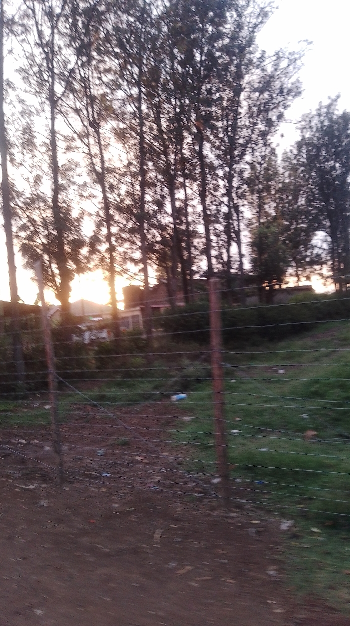 The image displays an outdoor scene in Nkaimurunya ward, Kenya, characterized by twilight conditions, either sunrise or sunset, evident from the strong orange and yellow light source low on the horizon behind a line of trees. The foreground consists of a reddish-brown dirt path or road, occupying the lower third of the frame. A wire fence runs horizontally across the mid-ground, featuring several dark, slender wooden posts and multiple strands of taut wire. Beyond this fence, a section of green grass is visible, containing scattered debris, including light-colored plastic items. In the background, numerous tall, slender trees, likely pine or eucalyptus, stand silhouetted against the bright sky, forming a dense canopy. Partially visible through and behind these trees are indistinct structures, possibly residential buildings, with a prominent orange glow from the sun centrally located behind them. No individuals are present in the scene.
