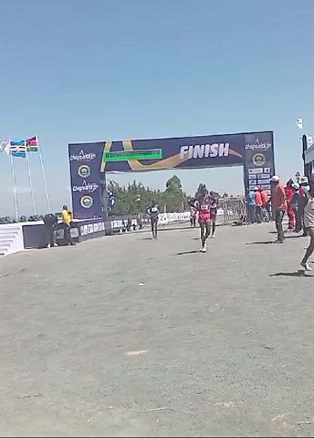 finish line for a race, likely a marathon or similar long-distance running event. Several runners are approaching the finish line, with spectators lining the side, many of whom appear to be officials or volunteers in orange and blue clothing. There is a large "FINISH" sign above the race pathway. Flags from Kenya and another country are on display nearby. A small stage is set up to the left of the finish line. The environment appears to be a somewhat hilly or mountainous area, with a wide view of trees and landscape in the background. It is a sunny day. A person walks in front of the camera carrying photography equipment.