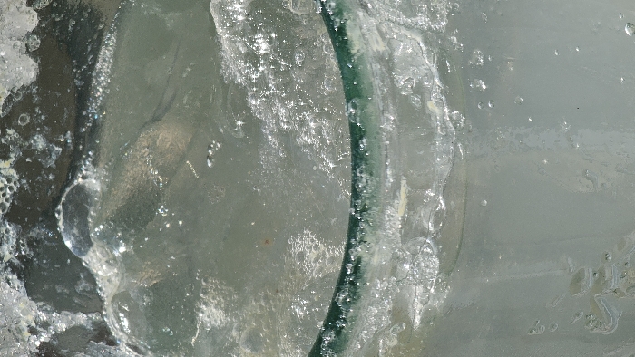 An abstract close-up of a clear, textured surface with bubbles and shimmering light. A thick, curved green line partially bisects the image, defining a division between different textural areas. One area features larger bubbles and a rougher surface, while the other appears smoother with scattered smaller bubbles. The light reflecting off the surface creates bright highlights, contributing to the overall sense of movement and liquidity.