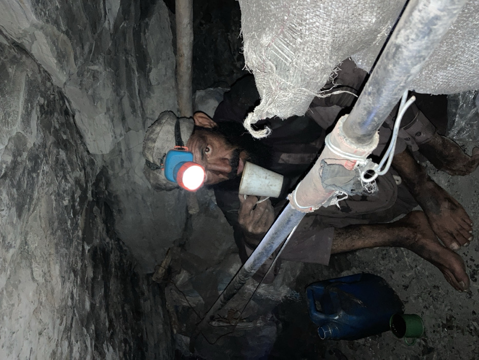 This image depicts a male individual within a dark, confined underground mine environment in Duki, Pakistan