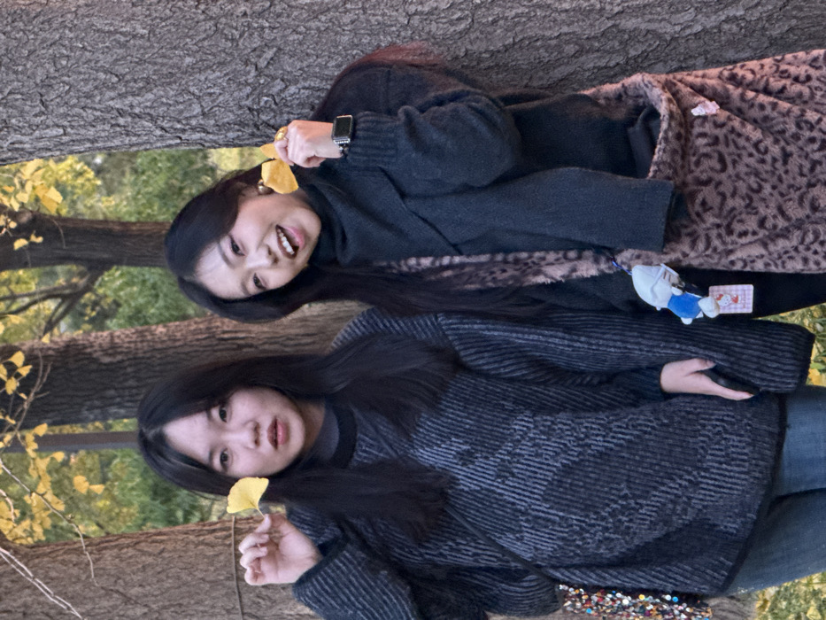 Two East Asian females are depicted standing outdoors in Xicheng District, China, against a backdrop of mature trees with yellow foliage, indicative of autumn
