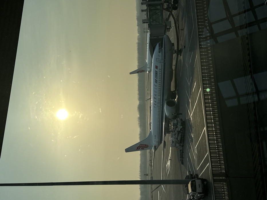 The image depicts an airport tarmac scene at Beijing Capital International Airport (PEK) in Shunyi District, China, viewed through a window, likely from a terminal building or passenger bridge
