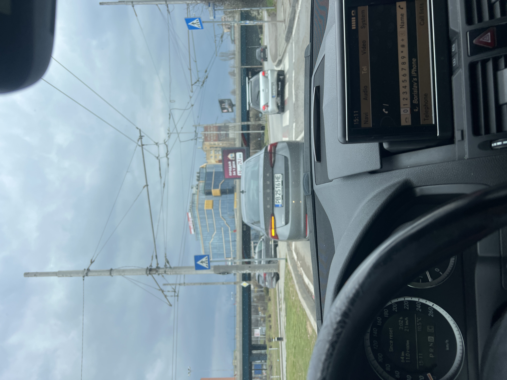 The image captures a first-person perspective from inside a stationary or slow-moving vehicle on a multi-lane urban road in Sofia, Bulgaria. In the immediate foreground, the top of a black steering wheel is visible on the left, along with a portion of the dashboard instrument cluster showing a digital display indicating "15:11" (time), "10.5°C" (temperature), "PRNDC" (gear selector), "21 km/h" (average speed), and "64 km" (distance driven). A central infotainment screen displays "15:11" and "Borislav's iPhone" under the "Telephone" menu. A red hazard light button is also visible on the dashboard. Directly ahead, a grey Skoda sedan with Bulgarian license plate PB 2516 HE is positioned in the same lane, suggesting stopped or slow traffic. Its right rear taillight appears illuminated. Further down the road, a silver Subaru wagon with a roof rack and a darker vehicle are also visible. A blue square sign with a white triangle and a black pedestrian figure, indicating a pedestrian crossing, stands on the right side of the road. The urban environment includes a prominent blue-painted concrete overpass/bridge spanning the road in the mid-distance. Numerous tall utility poles support a dense network of overhead wires, characteristic of trolleybus or tram infrastructure. Modern, multi-story buildings with glass facades, including one with blue and yellow sections, are visible beyond the overpass. A large billboard on the left side of the road displays the Bulgarian text "ПРОДАВА ЗАМЯ" (SELL LAND) and "2U.BG". Patches of dry grass are present on the median and roadside. The sky is overcast. The combination of the blue overpass, modern corporate buildings, and extensive trolleybus/tram infrastructure is consistent with a major thoroughfare in Sofia, specifically resembling areas along Tsarigradsko Shose boulevard.