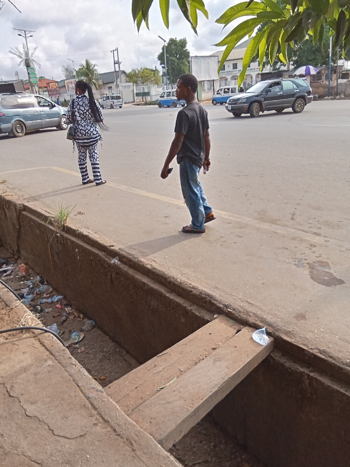 A partly shadowed scene captures two individuals near a street. A woman in patterned attire walks away from the viewer. A man in a t-shirt and jeans stands close to a roadside drain covered by a wooden plank. The drain is partially filled with trash. In the background, cars move along the street under a somewhat cloudy sky. The "University of Nigeria" sign is visible, indicating the location. Leaves from a tree hang in the top of the frame.