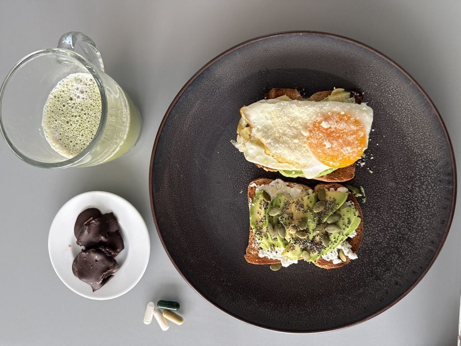 An overhead view displays a meal arranged on a light grey surface in Wattrelos, France. A large, round, dark grey ceramic plate, featuring a mottled texture and a rust-brown rim, occupies the lower portion of the frame. On this plate, two pieces of toasted bread are presented. The toast on the left is topped with a white, granular substance resembling cottage cheese, sliced avocado, dark chia seeds, and light green pumpkin seeds. The toast on the right is topped with a fried egg, exhibiting a set white and an intact orange yolk, generously sprinkled with white grated cheese. In the upper left quadrant, a small, round white ceramic saucer holds three irregularly shaped, dark brown objects, consistent with chocolate-covered items. Adjacent to the saucer, three capsules are positioned directly on the grey surface: one white, one off-white, and one dark green. To the upper right, a clear glass mug with a handle contains a frothy, light green liquid, indicative of matcha or a similar beverage. No individuals are visible.