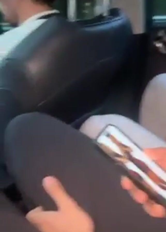 interior of a car, presumably the back seat. A person's hands are visible holding a phone and a glass bottle. Another person with curly hair is seen looking at their phone in the front seat. The overall environment suggests a casual car ride.
