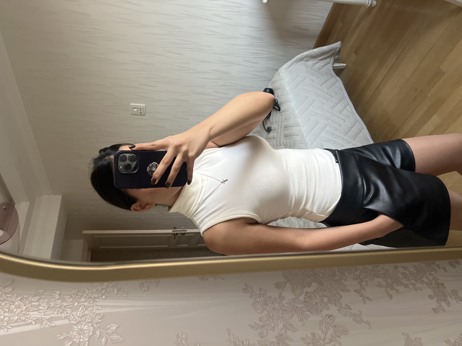 The image displays a female individual taking a mirror selfie indoors. The subject, positioned centrally and reflected in a gold-toned, arched mirror frame, is shown from the upper thighs upwards. She is holding a dark-colored smartphone, likely an iPhone 13 Pro or 14 Pro, which obscures her upper face. Her right hand grips the phone, while her left hand rests in the pocket of her shorts. She is attired in a form-fitting, sleeveless white turtleneck top and black leather-look shorts with pockets. A silver-colored chain with a small cross pendant is visible around her neck. Her fingernails are painted a dark, possibly burgundy or dark brown, color. The reflected background reveals a residential interior. The walls are light-colored; the left wall features a raised floral pattern in white, while the right wall displays a subtle vertical textured pattern. A partially open light wooden door with a brass-colored handle is visible behind the subject. A bed with a white quilted bedspread, exhibiting a geometric pattern, and white legs is present behind the subject on the right side of the frame. A coiled black cable or charger is visible on the bed surface. The flooring appears to be light-colored wood. A white electrical outlet is mounted on the right wall. The precise location within the city of Yerevan, Armenia, cannot be determined from the visual information provided in this image.