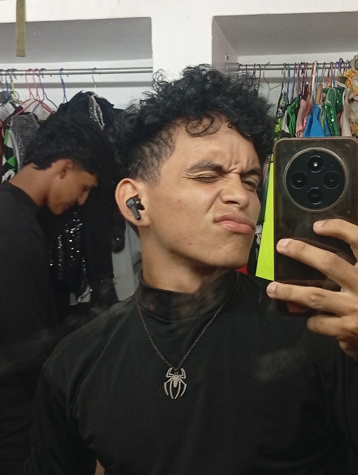 A young man takes a selfie, making a scrunched-up face with one eye squinted shut. He wears a black turtleneck and a spider pendant. An earbud is visible in his ear. Another person with a mullet stands behind him, partially obscured by hanging clothes on a rack. The selfie is taken indoors, likely in a room with a mirror and cluttered closet. The subject holds a modern smartphone with a large camera module.