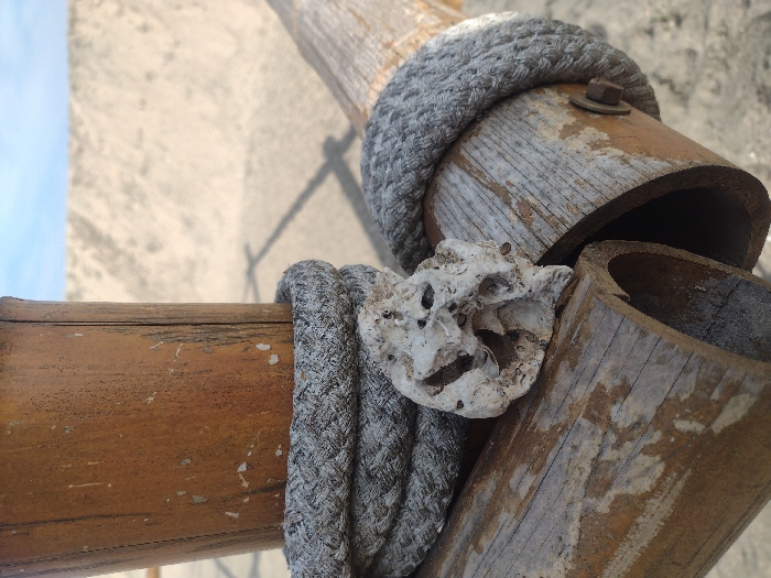 The image displays a close-up, angled view of a junction of weathered bamboo poles and rope in an outdoor, coastal setting within the city of Burgas, Bulgaria. A prominent vertical bamboo pole, light brown with numerous small white abrasion marks, is visible on the left. It is structurally joined by two horizontal or slightly diagonal bamboo sections. A thick, grey, weathered braided rope is wrapped multiple times around the junction, securing the poles. Resting on this rope, at the precise intersection of the poles, is a small, irregularly shaped, porous white object, consistent with a piece of dried coral or a marine calcified organism. One of the horizontal bamboo components appears to be a half-section, revealing its hollow, dark interior. A metal bolt with a washer is visible on the far right bamboo section, indicating a fastening point. The background is a blurred, light-colored sandy surface, characteristic of a beach, with faint shadows cast upon it. A sliver of clear, light blue sky is visible at the top of the frame.