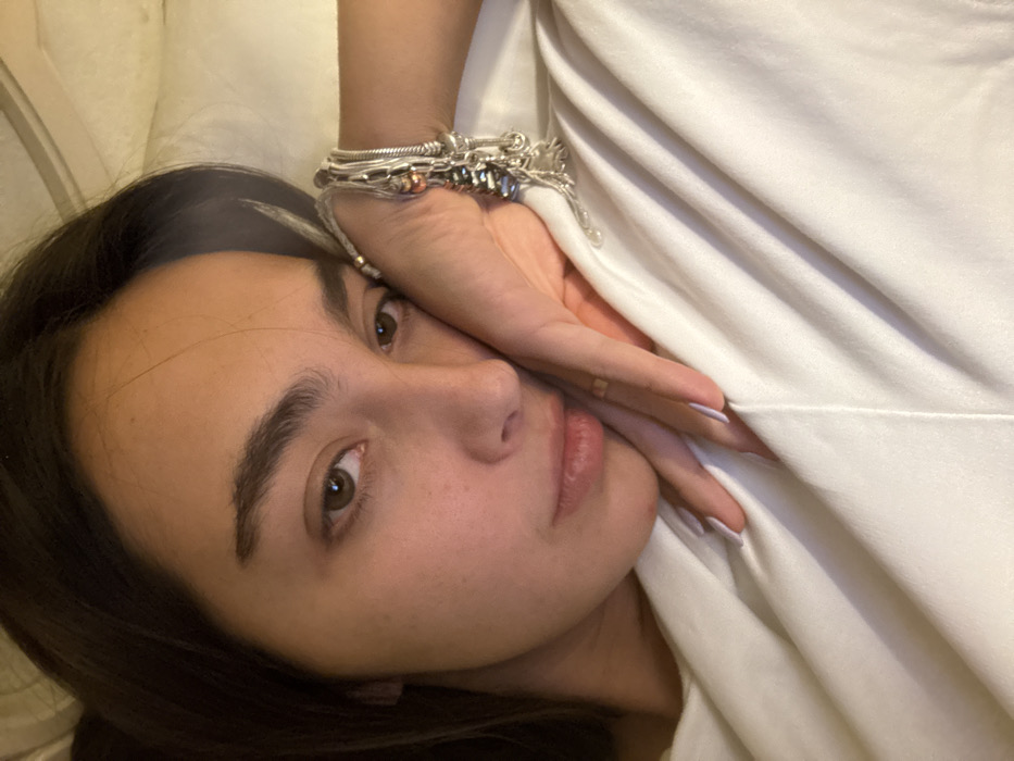 A close-up photograph depicts a single female subject lying down indoors, oriented toward the camera