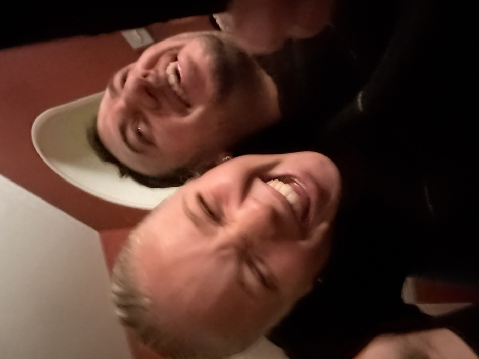 Two smiling individuals, a man and a woman, are pictured in a close-up, angled shot. The man, located towards the top, has short dark hair and a visible beard. The woman, positioned in the foreground, has short blonde hair. Both are wearing dark clothing. A white, round object is partially visible behind the man, possibly a plate. The background includes a glimpse of a red-brown wall on the left side. The image is well-lit, highlighting their joyful expressions.