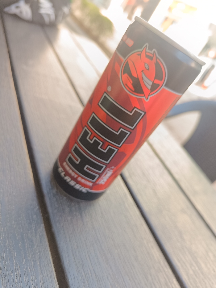- "A red and black HELL Energy Drink CLASSIC can is positioned diagonally on a light gray, slatted wooden table in Dupnitsa, Bulgaria" by FM-iHa0r2, licensed under CC BY 4.0
