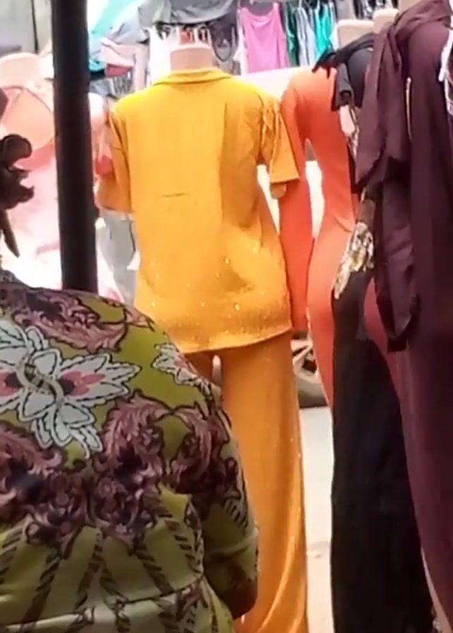 street scene with a woman kneeling in the foreground, facing a row of mannequins displaying clothes. The clothes on the mannequins are in shades of yellow, orange, purple, and brown. Clothes hanging under a white tarp can be seen behind the mannequins. A motorcycle is seen in the background. The focus of the scene is on the mannequins and the clothing they are displaying.