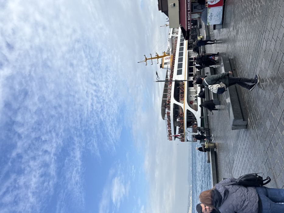 The image depicts a moderately busy ferry terminal in Istanbul, Turkey, bordering the Bosphorus strait