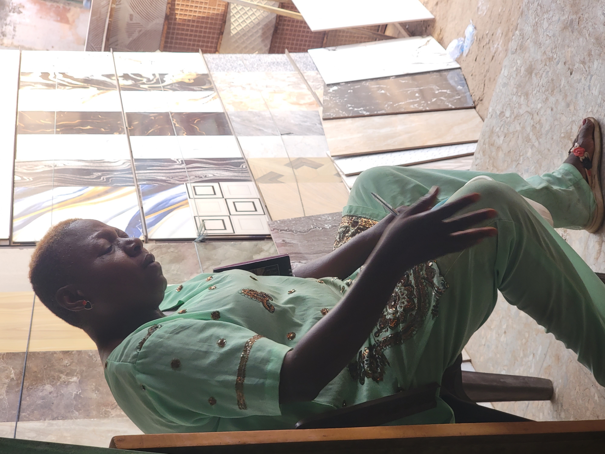 A person wearing a light green outfit, decorated with metallic gold designs, is lying on a wooden chair. The person is positioned in front of a display of various tiles, some with geometric patterns and others with marble-like textures. The person is wearing brown sandals and their head is slightly turned towards the left. The environment appears to be a store or showroom displaying tiles, and the presence of sunlight suggests it is daytime. The location is Maiburiji, Nigeria.