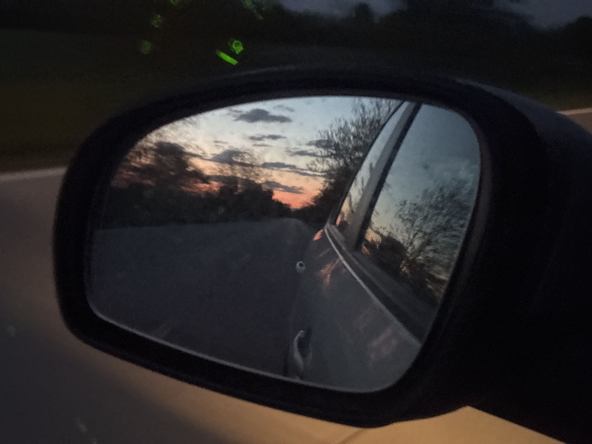 The image depicts a car's side mirror reflecting a sunset over a road