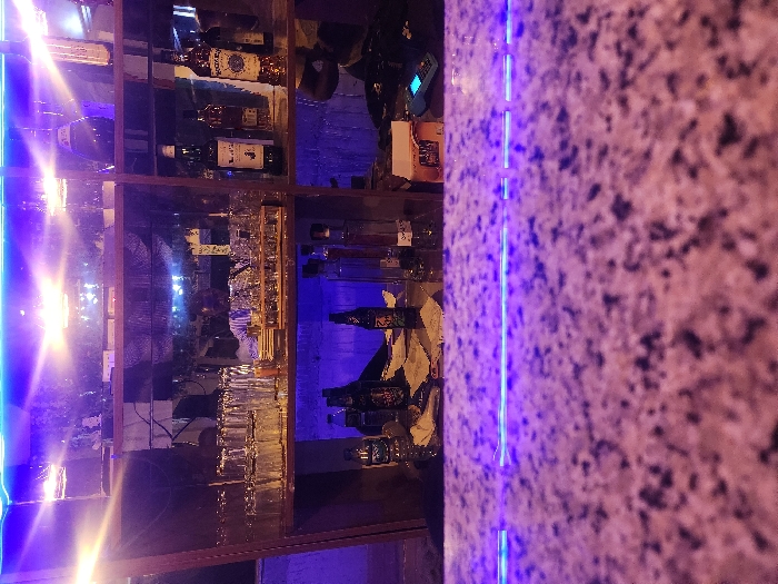 A dimly lit bar scene presents a cabinet filled with an assortment of bottles and glassware. The bottles are arranged on multiple shelves, with glasses hanging underneath. Adjacent to the cabinet, a textured surface, possibly a counter or wall, features a vertical strip of bright blue lighting. The overall scene is dark, with blue and purple hues dominating the color palette.