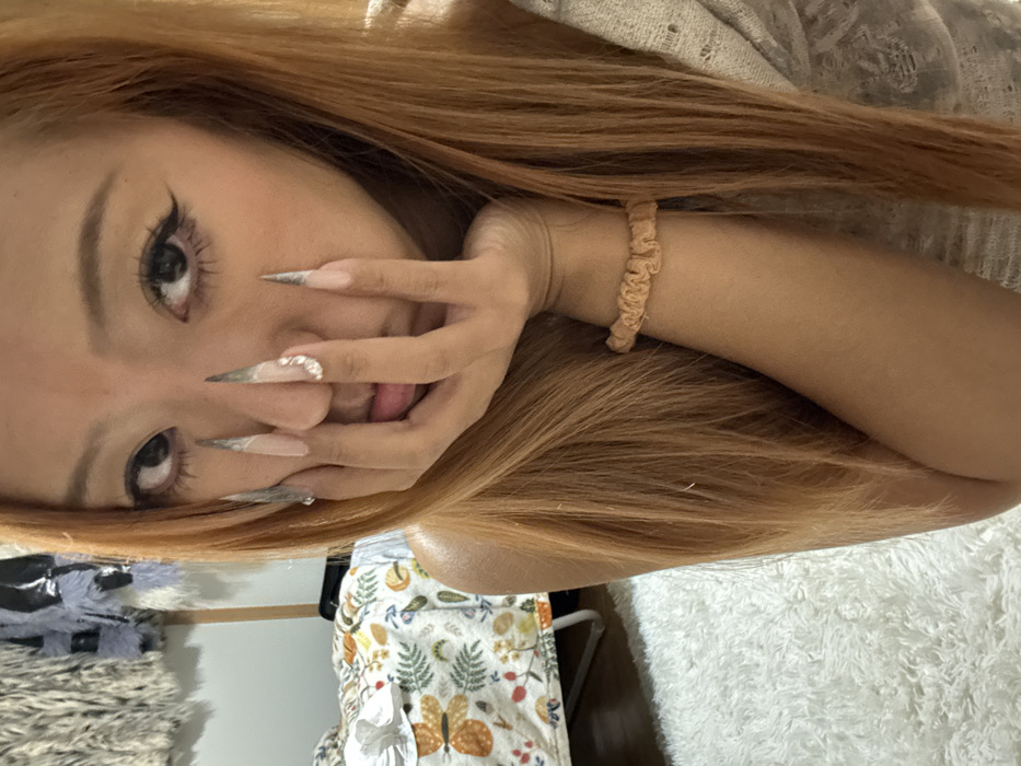 An indoor portrait, purportedly captured in Minato, Japan, features a female subject from the chest up, positioned facing the camera. She has long, straight, reddish-brown hair and dark eyes accentuated with black winged eyeliner. Her right hand is raised, with fingers partially obscuring her mouth, from which the tip of her tongue is slightly protruding. Her nails are long and stiletto-shaped; designs include nude bases with silver glitter tips, and the right middle finger's nail is adorned with rhinestones. A light peach fabric scrunchie or bracelet is visible on her right wrist. The background on the left reveals a bed with a white comforter patterned with green leaves and orange butterflies/moths, situated above a light wooden floor and a white shag rug. Multiple garments, including a light-colored faux fur item, hang on the wall behind the bed.