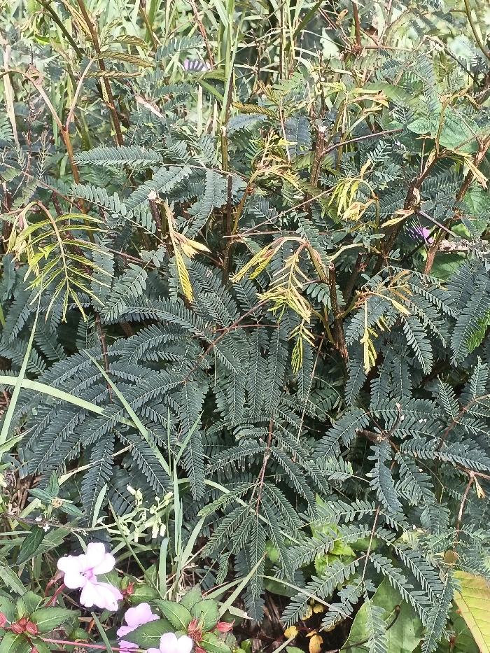 A dense bush with pinnate, feathery leaves dominates the frame. Some leaves display yellowing. Brown stalks support the foliage. At the base, clusters of pink impatiens flowers peek out amidst the greenery. Tall grasses mix within the scene, adding varied textures. The overall composition suggests a natural, overgrown setting.