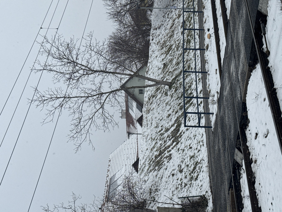 The image displays a winter street scene in Baden, Austria, under an overcast sky. In the foreground, snow-dusted railway tracks run horizontally across the frame, featuring dark gray crossing panels. A dark blue metal railing acts as a barrier, separating the railway area from a narrow, dark paved path. Directly behind the path, a steep embankment covered in patchy snow and dry grass rises. A bare-branched deciduous tree with a split trunk stands prominently on the embankment. In the midground, several residential houses with snow-covered brown tiled roofs are visible behind the embankment, with some roofs equipped with dark solar panels. Other leafless trees and dormant bushes are scattered throughout the background. Multiple dark power lines are visible stretching across the upper portion of the gray sky. No individuals or active movements are depicted in the scene.