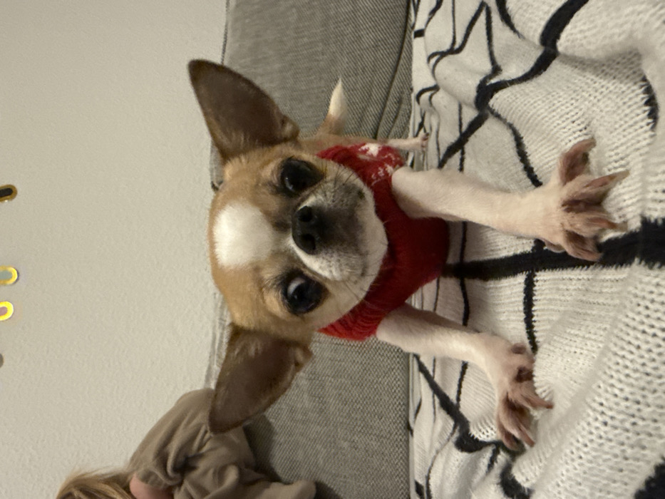 - "A tan and white Chihuahua wearing a red sweater lies on a white and black knit blanket" by FM-eQUGe2, licensed under CC BY 4.0