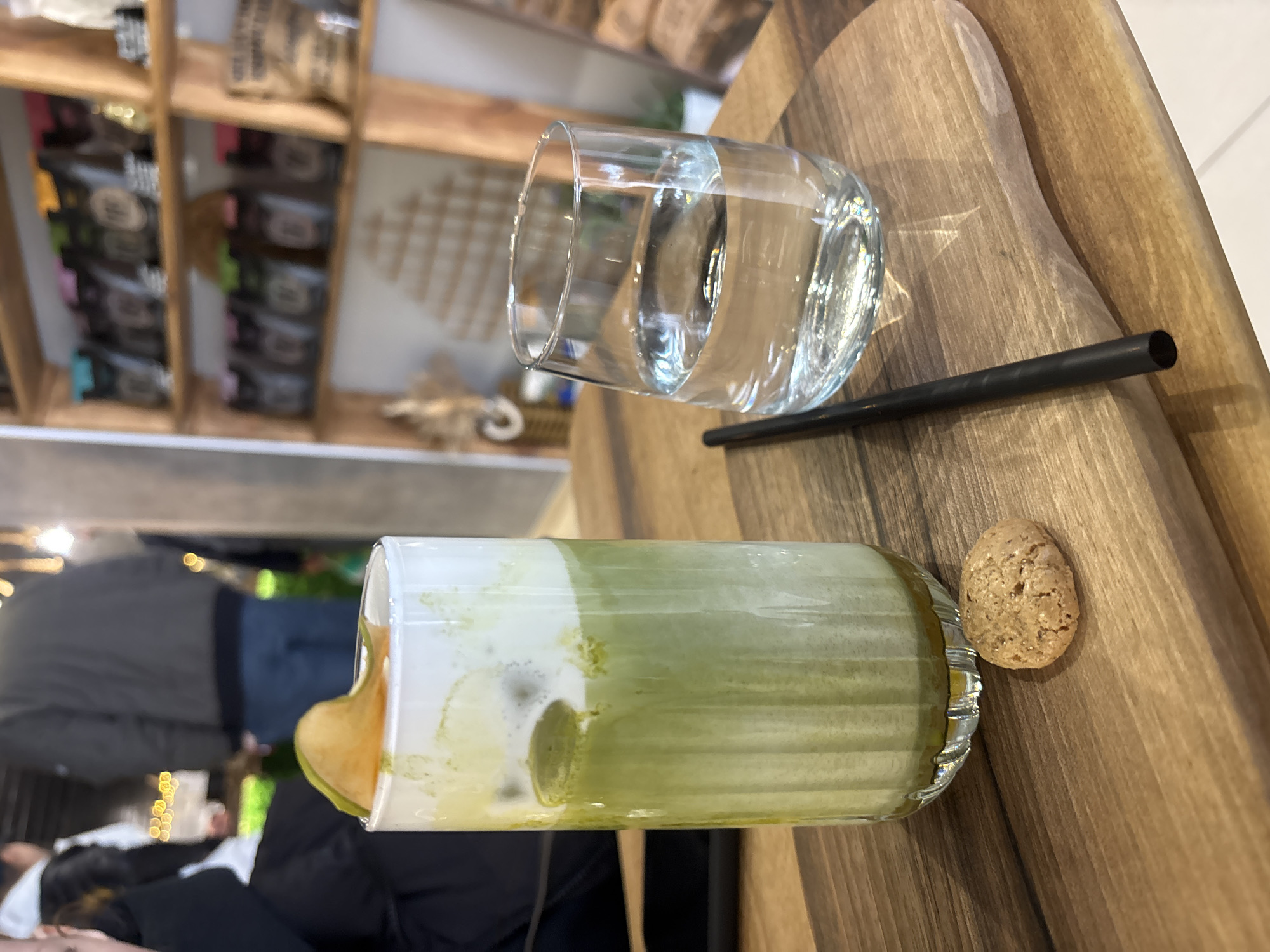The image presents an interior scene from a cafe or retail establishment located in Velingrad, Bulgaria. In the foreground, a tall, clear glass, featuring a ribbed texture, holds a layered beverage consisting of a vibrant green liquid at the bottom, transitioning into a white, foamy top. A thin, light orange fruit slice, possibly apple or pear, garnishes the rim. To the right, a smaller, clear glass contains water. A single, round, light brown cookie with an irregular, textured surface is positioned between the two glasses on a light brown wooden serving board. A black drinking straw lies horizontally on the board, situated below the water glass. The wooden board has a natural, slightly irregular edge visible on the right. The surface beneath the board is light-colored, and white tiled flooring is visible in the bottom right corner. The background is blurred, showing several indistinct human figures, one of whom is partially visible on the far left, wearing dark attire, and another in the center, wearing a dark jacket and blue jeans, facing away from the viewer. To the right, wooden shelving units are visible, displaying multiple dark-colored pouches with various colored tops, suggesting packaged products for sale, alongside other decorative items. Blurred light sources are discernible in the upper background.