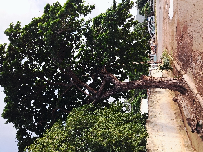 A large, leafy tree dominates the image. Its thick trunk lies horizontally along a low, light-colored wall, with roots visible on the ground. Green foliage fills the upper half of the picture and extends below the trunk. To the right, a sidewalk and street show signs of wear and tear, with patches and possibly puddles. A vehicle is vaguely visible further down the street. The overall perspective is slightly tilted.
