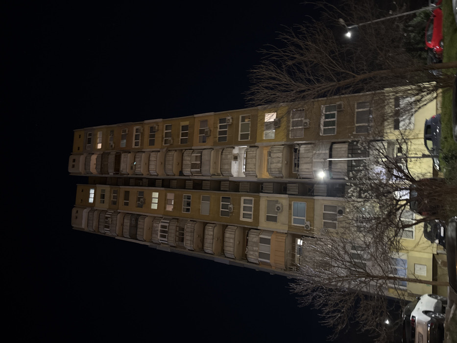 A tall residential building, identified as Blok 222, located at ul. "Devnya" 222, Zapadna Promishlena Zona, Varna, Bulgaria, is depicted at night. The structure is multi-storied, featuring a light yellowish-beige facade with numerous balconies, some enclosed with glazing and others open. Multiple air conditioning units are affixed to the exterior walls. Several windows across various floors are illuminated, indicating internal activity. The building exhibits a distinct architectural design, appearing as two closely aligned vertical sections with a central recess. In the foreground, multiple deciduous trees with bare branches are present, suggesting a late autumn or winter season. Several vehicles are parked at the base of the building, including a white SUV, a dark hatchback, and a red hatchback. Two streetlights are visible, casting illumination on the lower sections of the building and the ground. The sky is dark and clear. No individuals are visible, and no specific actions or interactions are occurring.