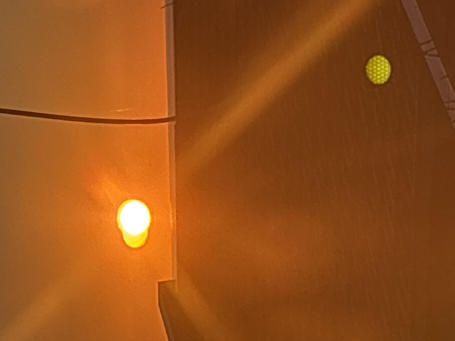 An indoor scene in Kunje, Montenegro, captured under strong artificial orange illumination. A primary, circular, bright white-yellow light source, likely an LED or small bulb, is positioned in the upper-left quadrant, casting a pervasive orange-amber glow across the entire frame. A dark, thin, vertical line, consistent with a cable or a structural seam, is visible extending downwards from the top edge in the upper-right section. The lower two-thirds of the image display a flat, textured horizontal surface, possibly a tabletop or floor, reflecting the orange light. A diagonal streak of light is visible across this surface, originating from the main light source. In the lower-right corner of this horizontal surface, a small, circular, yellow object with a discernible hexagonal grid pattern, suggestive of a reflector or indicator, is present. No people or discernible activities are depicted.