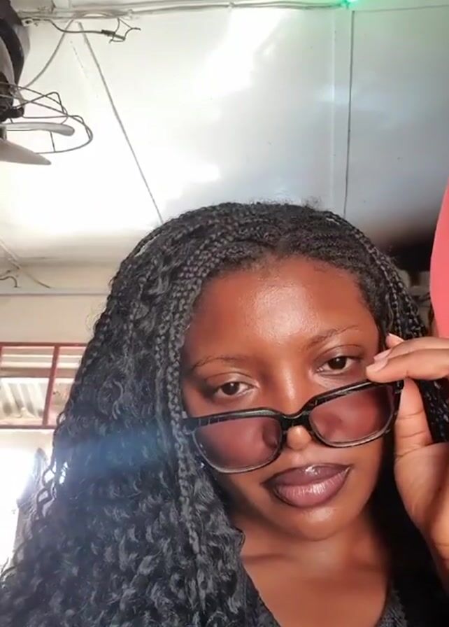A woman with dark skin, dark braided hair, and dark-framed glasses looks at the camera. She holds her glasses with one hand, cleans the lens with her hand, and smiles. The room is illuminated by a green light, and a ceiling fan is visible. A clothing rack with garments is in the background.