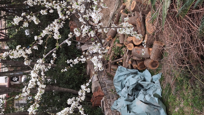 This image depicts an outdoor scene in Budva, Montenegro, likely a backyard or undeveloped lot, characterized by natural elements and construction/landscaping debris, during springtime. In the foreground, the ground consists of sparse green grass mixed with dry earth and patches of weeds. To the immediate left, a large, crumpled piece of pale blue/green tarp is spread across the ground. To the right, a substantial pile of dry, intertwined branches and twigs is visible, with a few green fronds at the bottom right. The midground is dominated by a large, disorganized pile of freshly cut logs and tree stumps of various sizes, many displaying light-colored, circular cross-sections. Several branches with numerous small white blossoms extend into this area, some appearing to rest on the logs. Behind the log pile, a low stone wall is partially visible, topped with multiple stacks of reddish-brown, curved roof tiles. The background features dense green foliage and numerous tree trunks and branches. Through an opening in this foliage, a light-colored building is visible. On the exterior of this building, a sign clearly displays the word "DALMATIN" above a paw print logo, pinpointing the specific urban location within Budva, Montenegro. The entire upper half of the image is permeated by branches of a deciduous tree covered in abundant white blossoms. No individuals are present in the scene. The presence of cut wood and stacked roof tiles indicates recent or ongoing maintenance or construction activity.