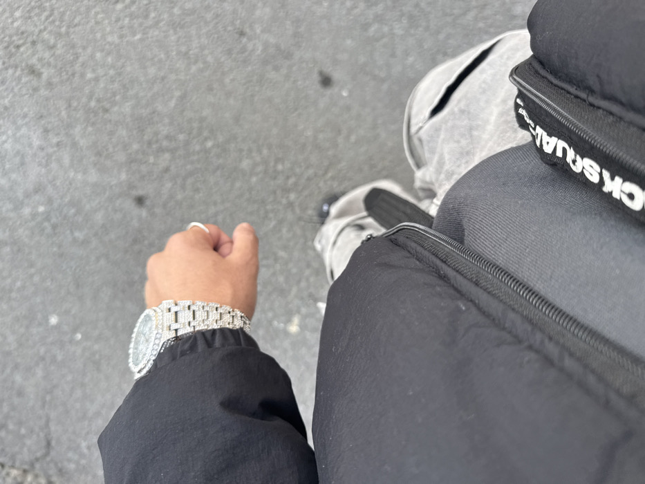 A high-angle photograph depicts a partial view of an individual standing on a gray paved surface, consistent with asphalt or concrete. The subject is wearing a black long-sleeved garment, partially obscuring the torso, and light gray, possibly stone-washed, cargo-style pants with a visible pocket flap on the right leg. A black accessory with white text reading "CK SQUAD" is partially visible at the bottom right. On the subject's left wrist, a large, silver-toned wristwatch is prominently displayed, featuring a bezel and bracelet fully encrusted with numerous clear, sparkling stones. A simple silver-toned ring is visible on a finger of the subject's right hand. No specific landmarks or environmental features are present in the image to determine a precise location within the city of Nesebar, Bulgaria.