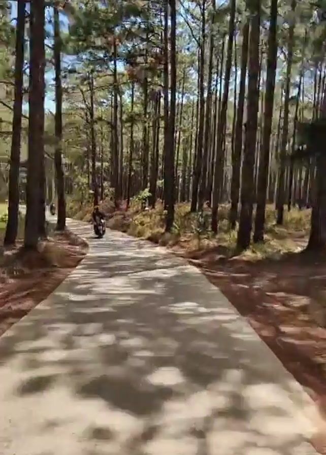 A video shows a person riding a motorcycle on a paved road through a pine forest on a sunny day