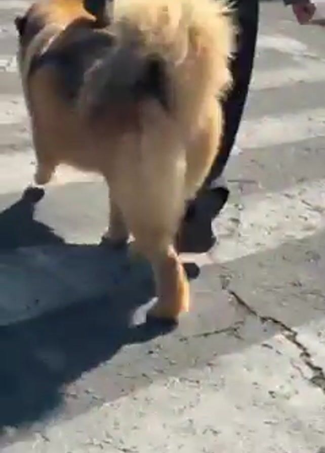 A brown and tan long-haired dog is being walked by someone in black pants across a pedestrian crosswalk. The dog's tail is very fluffy, and it occasionally glances to the side. The pavement is cracked, and sunlight casts strong shadows.