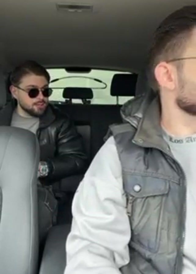 Two men are sitting inside a car. The man in the front passenger seat is wearing sunglasses, a gray sweatshirt, and a gray vest. The man in the back seat is also wearing sunglasses, a black leather jacket, and dark-colored pants. The man in the front passenger seat is pointing up to the car's interior light and turns it on. The man in the back seat raises his hands and yells, "Take it a notch!"